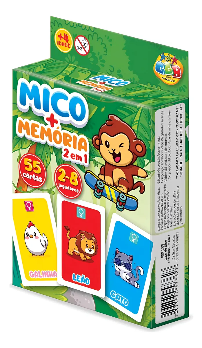 Diversão em dose dupla para toda a família! O Jogo Mico + Memória 2 em 1 da GGB traz duas brincadeiras clássicas em um único produto, com cartas coloridas e ilustradas com animais fofos que encantam crianças e adultos. Com o jogo do Mico, o desafio é simples: forme os pares e não fique com o Mico no final! Já o jogo da Memória estimula a concentração e o raciocínio lógico ao combinar os pares de figuras iguais. Indicado para crianças a partir de 4 anos, o jogo desenvolve atenção, memória visual, percepção e socialização — perfeito para brincar com amigos e família.