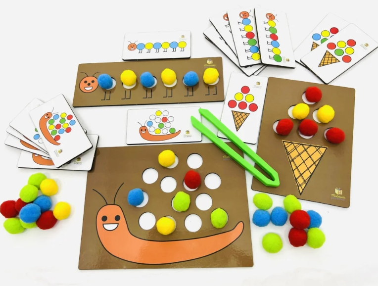 Contém: Placas perfuradas em MDF do Caracol, centopéia e sorvete, fichas modelos em MDF, 40 pompons em 4 cores e uma pinça reta.