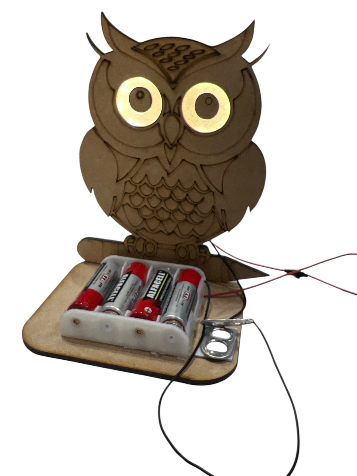 Com este kit, a criança monta sua própria coruja em MDF e realiza a ligação elétrica para acender a parte iluminada com fita de LED, tornando o projeto ainda mais encantador e interativo.