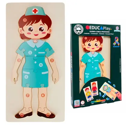 Composto por peças resistentes e de encaixe suave, o jogo ajuda a desenvolver habilidades como coordenação motora, percepção visual, concentração e ampliação do vocabulário. Ao montar as imagens completas, a criança aprende a relacionar cada profissão ao seu ambiente de trabalho e aos instrumentos utilizados.