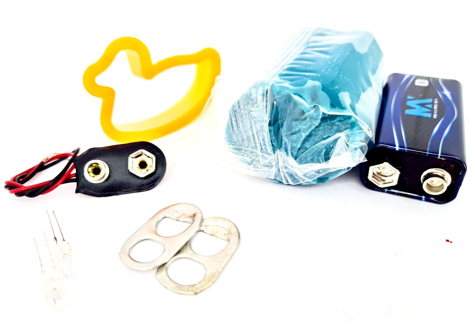 O kit vem com todos os itens necessários para criar circuitos simples de forma lúdica e criativa. Ele inclui uma massinha de modelar especialmente formulada para ser condutora, um clip de bateria, uma bateria de 9 volts, dois lacres de refrigerante, cortadores de massinha e leds de alto brilho.