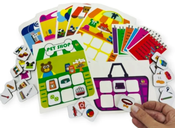 Contém: 6 cenários de lojas, cesta de compras, fichas dos produtos e listas.