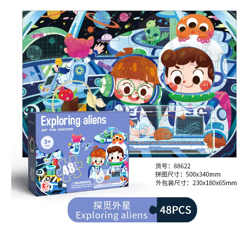 Com ilustrações divertidas de planetas, foguetes e simpáticos alienígenas, este quebra-cabeça de 48 peças é perfeito para estimular a imaginação e desenvolver o raciocínio lógico. Indicado para crianças acima de 3 anos, ajuda a trabalhar a coordenação motora, a concentração e a percepção visual enquanto elas montam um cenário cheio de cores e mistério espacial.
