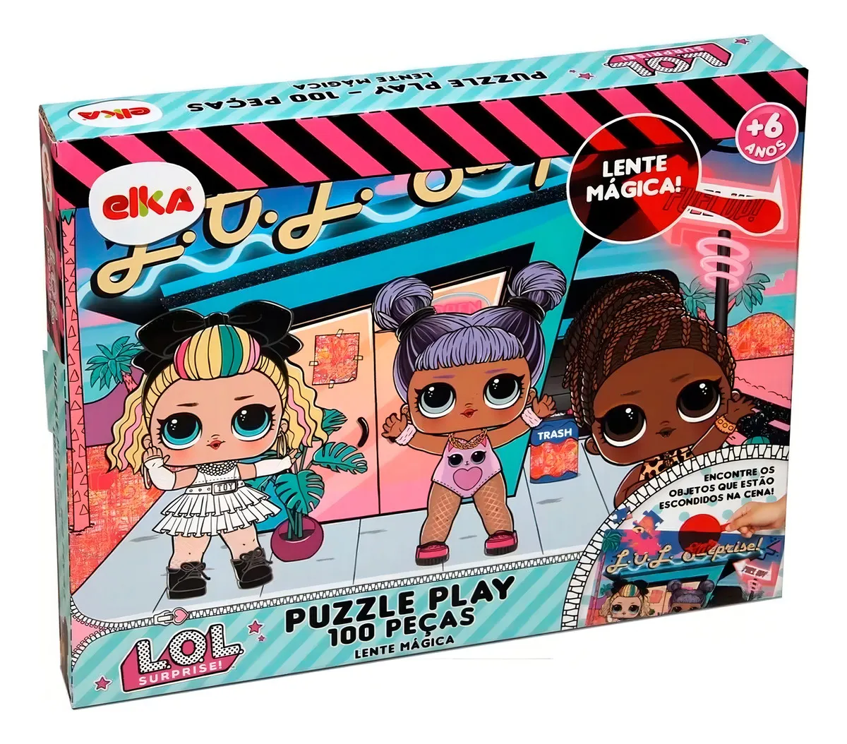Transforme o momento de montar quebra-cabeças em uma experiência surpreendente com o Quebra-Cabeça LOL com Lente Mágica da Elka! Além de montar a imagem com 100 peças, as crianças vão se encantar ao usar a lente mágica para descobrir objetos secretos escondidos no cenário! Após montar o quebra-cabeça, use a lente mágica para descobrir objetos escondidos na imagem: tiara, coração, óculos, flor, laço e estrela! Você desfrutará de longas horas de entretenimento garantido, aumentando sua concentração e sua criatividade. Diversão, magia e aprendizado em uma única brincadeira!