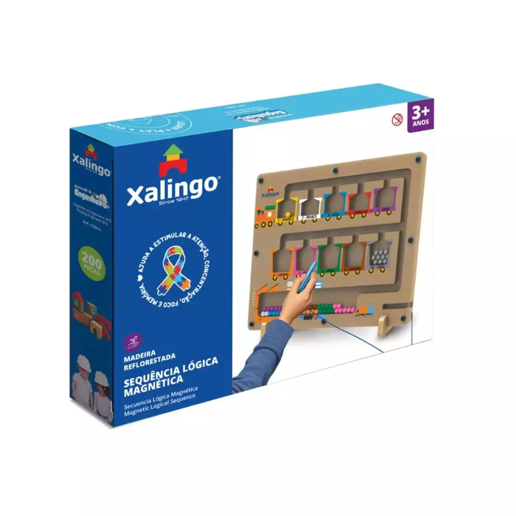 A Sequência Lógica Magnética Xalingo é um brinquedo educativo composto por 57 peças magnéticas que estimulam o raciocínio lógico, a atenção e a criatividade das crianças.